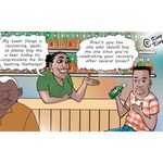 The intimidated girl is soon holding a piece of paper showing the bill which she hands over to the tall fellow who looks it critically, then, bending down his tall frame to look at his “baby,” she says: “So, dear, you’ve taken eight Serengeti Lites?”