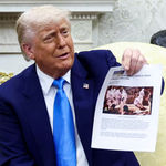 U.S. President Donald Trump hands over to South African President Cyril Ramaphosa copies of articles that he said showed white South Africans who had been killed, in the Oval Office of the White House in Washington, D.C., U.S., May 21, 2025. PHOTO | REUTERS