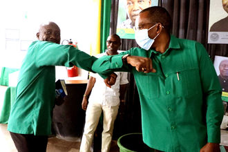 Kawe MP Bishop Josephat Gwajima talking to Ukonga MP Jerry Silaa as the two wait to enter the CCM ethics committee hearing in Dodoma. Photo| Said Khamis
