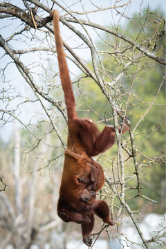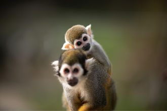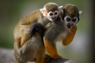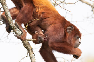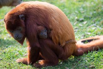 recently born male Red Howler monkey, Shongo, holds onto his mother Yerba, on April 2, 2021 at the Planete Sauvage zoologic park in Port-Saint-Pere, outside Nantes. Shongo, born on February 16, is the first red howler monkey to born in captivity in France, and are native to South and Central American forests. The International Union for Conservation of Nature last week identified the red howler monkey in its Red List of threatened species.