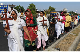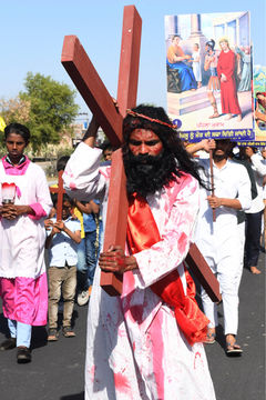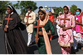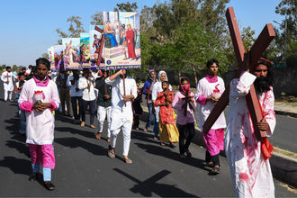 A Christian devotee reenacting Jesus Christ carrying a cross is followed by devotees during a Good Friday procession near Khasa village, some 35 km from Amritsar on April 2, 2021. NARINDER NANU / AFP