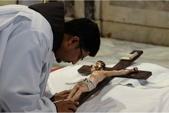 A Catholic priest kisses the feet of a Jesus Christ on a cross effigy during a mass on Good Friday at Saint Lucia's Church in Colombo on April 2, 2021. LAKRUWAN WANNIARACHCHI / AFP