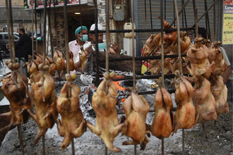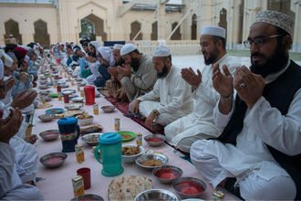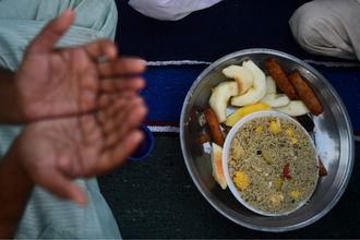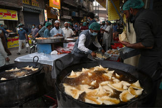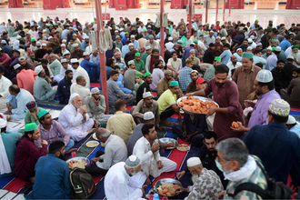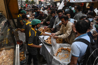 Volunteers serve Itar food for Muslim devotees before they break their fast on the first day of the Islamic holy month of Ramadan, at the Mamon Mosque in Karachi on April 14, 2021.