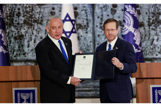 Israel's President Isaac Herzog (R) and Likud party Chairman Benjamin Netanyahu pose for a photograph after the former tasked the latter with forming a new government, in Jerusalem, on November 13, 2022. Hezog formally designated Benjamin Netanyahu to form a government, a victory for the former veteran prime minister who had vowed to return to power.