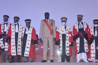 Guinea junta leader Colonel Mamady Doumbouya, raises his hand at his swearing in ceremony as president of country transion on October 1, 2021 in Conakry. The head of the junta in Guinea, Colonel Mamady Doumbouya, was sworn in on Friday as president of this West African country for a period of transition of still unknown duration and content.
