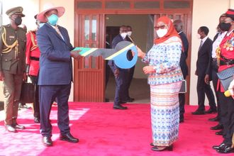 Ugandan President, Yoweri Museveni, has on November 29, 2021 handed over to Tanzanian President Samia Suluhu Hassan a primary school he built in Chato District, Geita region. PHOTO | MGONGO KAITIRA
