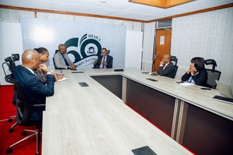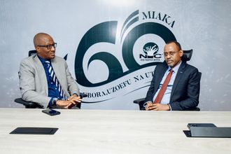 Managing director of Mwananchi Communications Limited (MCL), Bakari Machumu (left), and managing director of the National Insurance Corporation of Tanzania Ltd. (NIC), Dr Elirehema Doriye, shake hands as a sign of cooperation between the two companies after signing a commercial relations agreement in Dar es Salaam on October 19, 2023.