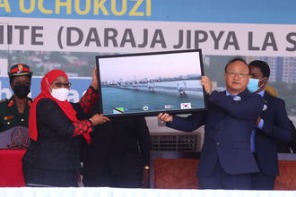 President Samia Suluhu Hassan receives a picture of Tanzanite Bridge from the Korean ambassador to Tanzania, Mr Kim Sunpyo, in Dar es Salaam yesterday during the commissioning of the 1.03km bridge built over the Indian Ocean. PHOTO | SUNDAY GEORGE