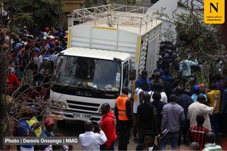 A truck carrying evidence for Azimio presidential petition arrives at the Milimani Court. PHOTO | NMG