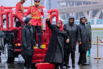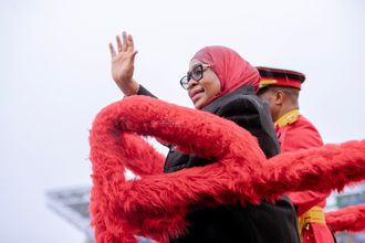 President Samia Suluhu Hassan waves as she attends a ceremony marking the country’s 60th union anniversary at Uhuru Stadium in Dar es Salaam on 26th April, 2024. PHOTO | STATE HOUSE