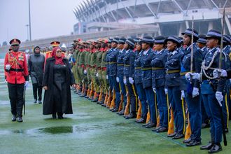 President and Commander-in-Chief, Samia Suluhu Hassan inspects a guard of honour during the 60th anniversary celebrations of the Union held at Uhuru Stadium in Dar es Salaam on April 26, 2024. PHOTO | STATE HOUSE