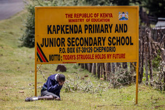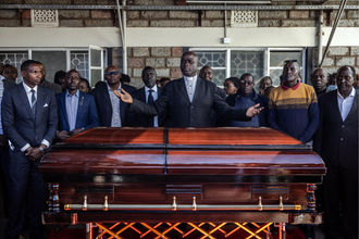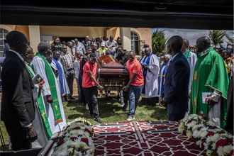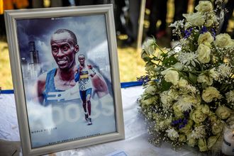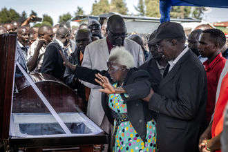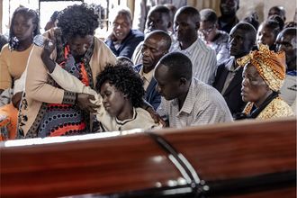 Kelvin Kiptum’s mother Mary Kangongo (2nd L) followed by Kelvin Kiptum wife Asenath Rotich (2nd R) are comforted by other family members while arriving at the mortuary ahead of the beginning of his funeral proceedings in Eldoret, on February 22, 2024.