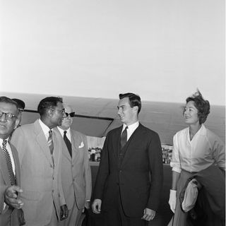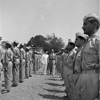 Prince Karim Aga Khan (L) inspecting the guard of honour drawn up at the airport prior the ceremony enthroned him as forty-ninth Imam of Nizari Ismailis, following the death of his grandfather, the Aga Khan III, on July 11, 1957. AFP