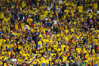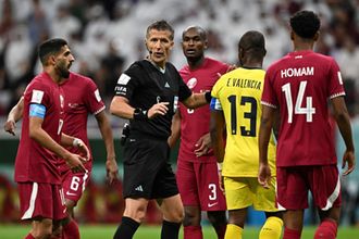 Ecuador's forward #13 Enner Valencia (center R) heads the ball into the net but the goal was disallowed during the Qatar 2022 World Cup Group A football match between Qatar and Ecuador at the Al-Bayt Stadium in Al Khor, north of Doha, on November 20, 2022.
