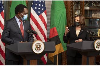 Zambia President Hakainde Hichilema and US Vice President Kamala Harris meet in Harris' ceremonial office in the Eisenhower Executive Office Building on the White House complex in Washington.