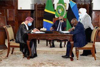 Zanzibar President Hussein Ali Mwinyi watches the signing at the State House in Zanzibar yesterday of an agreement to construct a new modern port at Malindi in the Isles. The construction will be undertaken by investors from Oman. PHOTO | STATE HOUSE
