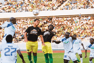 Yanga’s Brazilian forward Geilson Santos alias Jaja (third left) and defender Nadir Haroub vie for the ball against Thika United players during their friendly match at the National Stadium yesterday. Yanga beat the Kenyan side 1-0. photo | michael matemanga