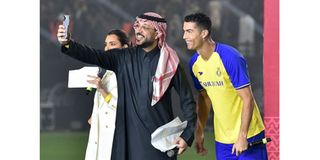 Al-Nassr's new Portuguese forward Cristiano Ronaldo (R), wearing a cross earing, poses for a selfie with the presenters during his unveiling at the Mrsool Park Stadium in the Saudi capital Riyadh on January 3, 2023. PHOTO/ AFP