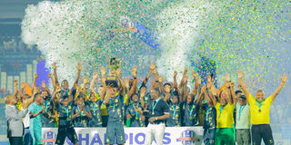 Zanzibar President Dr Hussein Ali Mwinyi (standing first from left) applauds Young Africans (Yanga) players after they won the NMB Mapinduzi Cup trophy, following a 5–4 penalty shootout victory over Azam FC at Gombani Stadium on Tuesday. PHOTO |COURTESY