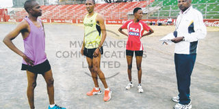 Team Tanzania athletes for the Rio Games during a training session in Arusha last week with their coach Francis John (right). From left Saidi Makula, Alphonce Simbu and Sarah Ramadhani. PHOTO | YOHANA CHALLE