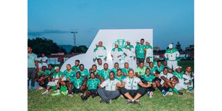 CRDB Bank Group Chief Executive Officer, Abdulmajid Nsekela (standing third from left), poses for a group photo with Ulipo Tupo team after they won the CRDB Supa Cup title at Sheikh Amri Abeid Stadium in Arusha. The team defeated CRDB Wakala 1–0 in the final. PHOTO | COURTESY