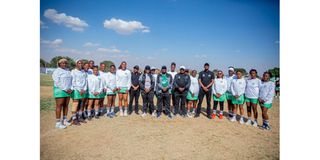The Director of Banking Operations at CRDB Bank Plc, Admin Mwansasu (in a green T-shirt), poses for a group photo after officially opening the CRDB Bank International Supa Cup tournament. Also in the photo (from left) are Central Zone Leader Chabu Mishwaro, Dar es Salaam Zonal Manager Muhumuliza Buberwa, and Head of Employee Relations, Timothy Fasha, along with participants from Burundi’s Nzovu and Imbeje teams, representing the Coastal Zone. PHOTO/COURTESY