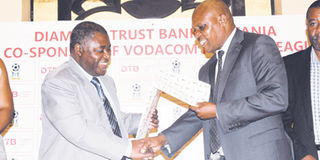 DTB Tanzania chief finance officer Joseph Mabusi and TFF president Jamal Malinzi (left) exchange documents after signing a Premier League sponsorship deal worth Sh250 million in Dar es Salaam yesterday. PHOTO | BOSHA NYANJE