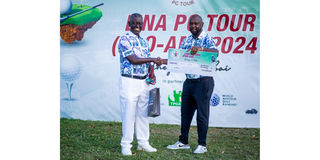 Veteran golfer Saidi Nkya (left) presents a dummy cheque to Fadhyl Nkya, winner of the second edition of the Lina PG Tour for professional golfers.. PHOTO | COURTESY