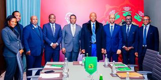 Minister for Information, Culture, Arts and Sports, Paul Makonda (fifth left) in poses for group with Caf President Patrice Motsepe (fourth left) soon after brief meeting in Rabat, Morocco. Others are Permanent secretary of Ministry for Information, Culture, Arts and Sports Gerson Msigwa (fourth left), Tanzania Football Federation (TFF) president, Wallace Karia (third left), Acting director of Sports Development Boniface Tamba (second left) and National Sports Council (NSC) secretary general, Neema Msitha (first left). Also in the photo are Ambassador of the United Republic of Tanzania serving in Morocco and France Ali Jabir Mwadini (third right) and Caf General Secretary Véron Mosengo-Omba (second right). PHOTO | COURTESY