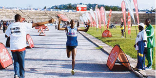 Tanzania’s Alphonce Felix crosses the finish line to win the men’s 21km (half marathon) in the Rock City Marathon in Mwanza yesterday. He clocked 1:02:21. PHOTO | MIGUEL SULEYMAN