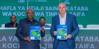 Tanzania Football Federation (TFF) President, Wallace Karia (front row, left), and newly appointed Taifa Stars head coach, Miguel Gamondi (front row, right), proudly display the signed two-year contract. The ceremony is witnessed by the Minister of Information, Culture, Arts and Sports, Paul Makonda (back row, right), and the Permanent Secretary in the same ministry, Gerson Msigwa (back row, left).