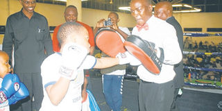 Emmanuel Mlundwa holds the mitts for Zainabu Mhamila, one of the children reached by the WBO Kids Drug Free Programme.