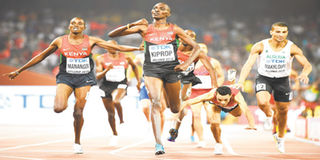 Kenya’s Asbel Kiprop (centre) reacts as he croses the finish line ahead of Kenya’s Elijah Motonei Manangoi, Morocco’s Abdalaati Iguider (lower) and Algeria’s Taoufik Makhloufi in the final of the men’s 1500 metres athletics event at the 2015 IAAF World Championships at the “Bird’s Nest” National Stadium in Beijing on August 30, 2015. PHOTO | AFP