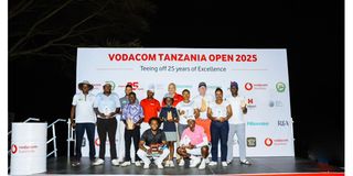 Vodacom Tanzania PLC Board Chairman David Tarimo (fifth from right) poses with winners of the Vodacom Tanzania Open Golf Championship. The men’s category was led by Kenya’s Njoroge Kibugu, while Tanzania’s Madina Idd topped the women’s division. The tournament featured more than 150 golfers from eight African countries and concluded last weekend in Arusha. PHOTO |COURTESY