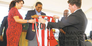 Sunderland AFC’s chief executive Margaret Byrne (left) and an official of the club present to President Jakaya Kikwete a Sunderland jersey when they paid him a courtesy visit. PHOTO | FILE
