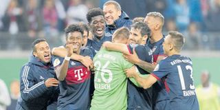Bayern Munich's Austrian defender David Alaba (2ndL) celebrates with his teammates after winning the penalty shoot out and the match after the German Cup (DFB Pokal) football match RB Leipzig v FC Bayern Munich in Leipzig, eastern Germany on October 25, 2017. / AFP PHOTO