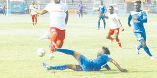 Mbao FC defender, Amos Charles (down) challenges Simba’s Shomari Kapombe during the Mainland Tanzania encounter at the CCM Kirumba Stadium. Mbao won 1-0. PHOTO | MICHAEL JAMSON