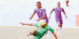 Mbeya City striker Paul Nonga vies for the ball with Academie Tchite defender (down) as Felix Themi looks on during their Cecafa Nile Basin Cup group B match on Saturday. City won 3-2.