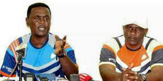 Taifa Stars’ new head coach Charles Boniface Mkwasa (left) responds to questions during a press conference in Dar es Salaam yesterday. On his left is his assistant, Hemed Morocco. photo | said khamis