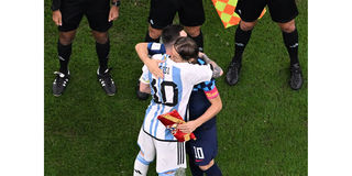 Argentina's forward #10 Lionel Messi hugs Croatia's midfielder #10 Luka Modric before the start of the Qatar 2022 World Cup football semi-final match between Argentina and Croatia at Lusail Stadium in Lusail, north of Doha on December 13, 2022.