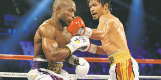 Manny Pacquiao (right) lands a left to the chin of Timothy Bradley Jr. during their welterweight championship fight on Saturday at MGM Grand Garden Arena in Las Vegas, Nevada. Pacquiao won by unaimous decision. PHOTO | AFP