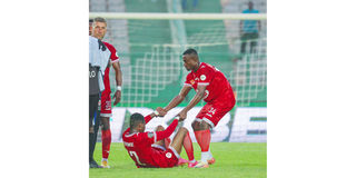 Simba attacking midfielder Elly Mpanzu attempts to lift captain Shomari Kapombe after their CAF Champions League match against Stade Malien in Bamako on Sunday night. Simba lost 2–1. PHOTO/COURTESY