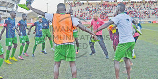 African Lyon players and their coach celebrate after beating Simba 1-0 during their Vodacom Premier League match at the Uhuru Stadium yesterday. Lyon won 1-0. PHOTO | OMAR FUNGO