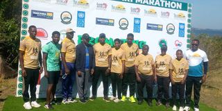 Ilemela District Commissioner Amiri Mkalipa (in a black jacket) poses with runners from Mbogwe, Geita, who have confirmed their participation in the 8th edition of the Serengeti Safari Marathon scheduled for November 15.PHOTO | DAMIAN MASYENENE