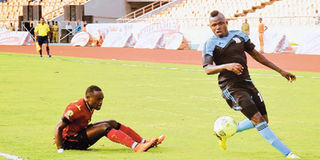 Taifa Stars striker Thomas Ulimwengu (right) makes his way past defender Zainadine Junior of Mozambique during a past international friendly match at the National Stadium. He is among players the national team banks on for goals in today’s match against Benin. PHOTO | FILE