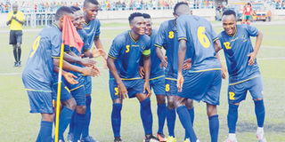 The national Under-20 soccer team players celebrate a goal during their international friendly match against Morocco’s Young Atlas Lions at the Uhuru Stadium yesterday. The Tanzanian boys won 1-0. photo| said khamis