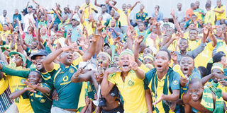 Yanga fans cheer during a recent Vodacom Premier League match. The reigning champions beat Toto Africans 2-1 at Kirumba Stadium yesterday to go seven points clear at the top of the table. PHOTO|FILE
