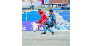 Coastal Union attacking midfielder Shiza Kichuya (left) battles for possession against a Tanzania Prisons player during a league match. PHOTO | COURTESY