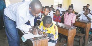 > A teacher instructs pupils under the new Education Policy ,instruction at all levels of education will be given in Kiswahili.