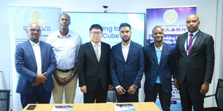 From L to R: Head of ICT at China Dasheng Bank Mr Ramadhan Mbaga, Warioba Venture Chief Executive Officer Mr Martin Warioba, China Dasheng Chief Executive Officer Mr Xu Yueliang, Wecodee Chief Executive Officer Mr Karthik Manoharan, Head of Operations at China Dasheng Bank Mr Hussein Hamisi and Head of Legal and Company Secretary Mr Ezra Nicholous in a group photo after signing the agreements on the bank’s digital transformation journey on Friday, January 23, 2026 in Dar es Salaam.